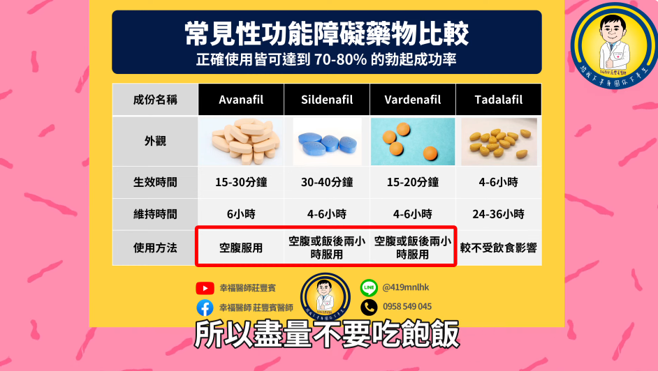 | 起效時間 (ED) | 需連續服用數天達到穩定濃度,提供24小時潛在勃起能力 | 單次服用後約30分鐘至1小時起效 |